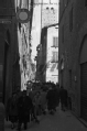Le persone che passeggiano indossano abiti invernali e le vetrine dei negozi hanno le saracinesche abbassate. A destra della foto si può notare parte della Torre delle Ore.