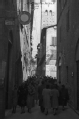 Le persone che passeggiano indossano abiti invernali e le vetrine dei negozi hanno le saracinesche abbassate. A destra della foto si può notare parte della Torre delle Ore.