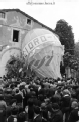 [Lucca : Gignano di Brancoli : sagra del balloccioro : la folla dei partecipanti davanti ad un casolare, ad una finestra del quale è fissato il pallone di una mongolfiera, in fase di riempimento d'aria : 24 ottobre 1976 (CPR 913)]