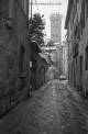 [Lucca : scorcio di via delle Chiavi d'Oro; sul fondo, Torre Guinigi con illuminazione natalizia sui lecci della sommità : gennaio 1979 (CPR 1916)]