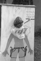 [Lucca : Porcari : Rughi : sagra dei cialdoni e del vino : ragazza dietro la sagoma di un pistolero con il buco per la testa e fumetto "Spara prima te, tanto non mi centri!", per il gioco del lancio della spugna bagnata : settembre 1976 (CPR 2961)]
