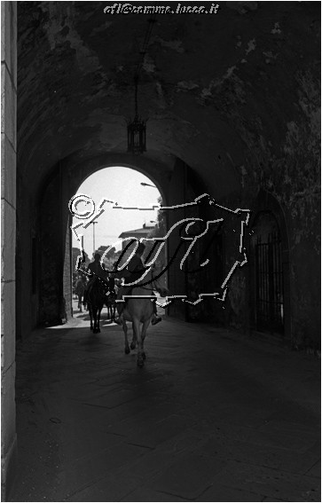 [Lucca : manifestazione equestre : cavalli con cavalieri in ingresso da Porta Elisa : maggio 1982 (CPR 4185)]