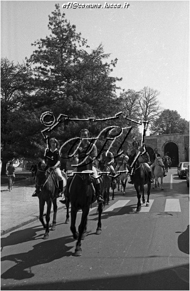 [Lucca : manifestazione equestre : cavalli con cavalieri in via Elisa : maggio 1982 (CPR 4189)]