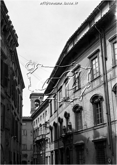[Lucca : via Cesare Battisti : scorcio con le facciate dei palazzi Minutoli Tegrimi e Tucci; sul fondo, il campanile della chiesa di San Salvatore : ca. 1967 (UDN 519)]