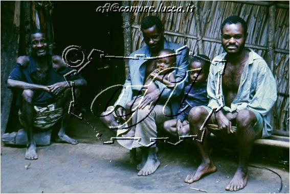 [Cameroun (Africa) : Kribi : accampamento di Pigmei Ba-Binga : uomini e bambini all'esterno di una capanna : luglio 1998 (RGS 7314)]