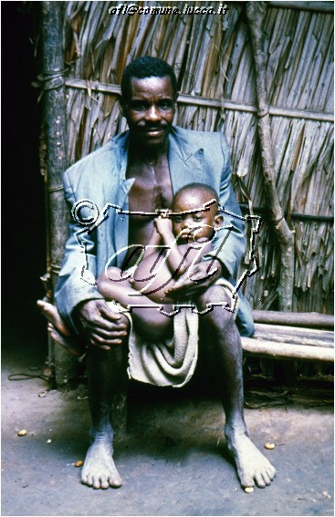 [Cameroun (Africa) : Kribi : accampamento di Pigmei Ba-Binga : uomo con bambino all'esterno di una capanna : luglio 1998 (RGS 7315)]
