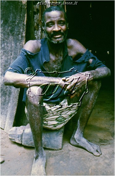 [Cameroun (Africa) : Kribi : accampamento di Pigmei Ba-Binga : uomo seduto all'esterno di una capanna : luglio 1998 (RGS 7316)]