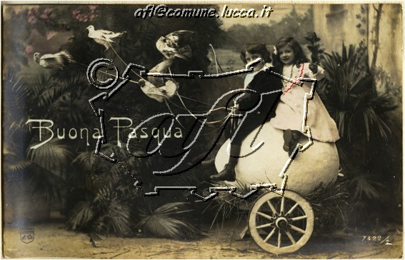 [Cartolina augurale di buona Pasqua con bambino e bambina seduti su un uovo sistemato su un calessino trainato da colombe (JMF 3112)