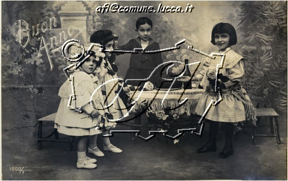 [Cartolina augurale di buon anno con gruppo di bambini presso un tavolino con bottiglia di spumante e panettone (JMF 3118)