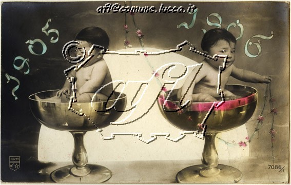[Cartolina augurale di buon anno 1906 con fotomontaggio con ritratti di bambino in una coppa di champagne (JMF 3127)