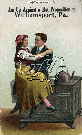 [Cartolina con scenetta di vita coniugale e la dicitura "Am Up Against a Hot Proposition in Williamsport, PA." (JMF 3387)