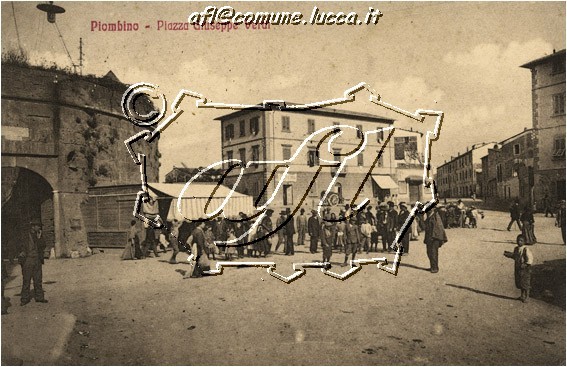 Piombino : Piazza Giuseppe Verdi [con bancarella presso il Rivellino : ca. 1910 (VAF 3513)]