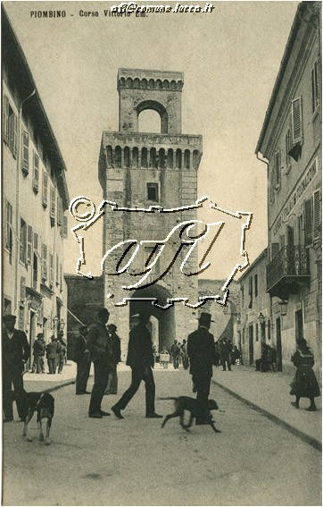 Piombino : Corso Vittorio Em. [con il Torrione : ca. 1909 (VAF 3526)]