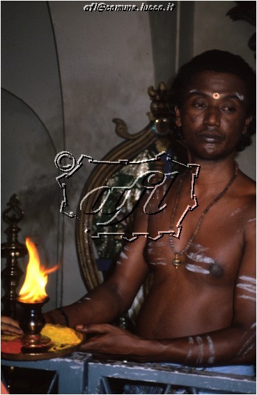 [Singapore : quartiere cinese di Chinatown : tempio indù di Sri Mariamman : induista che esegue una cerimonia : ottobre 1987 (RGS 8014)]