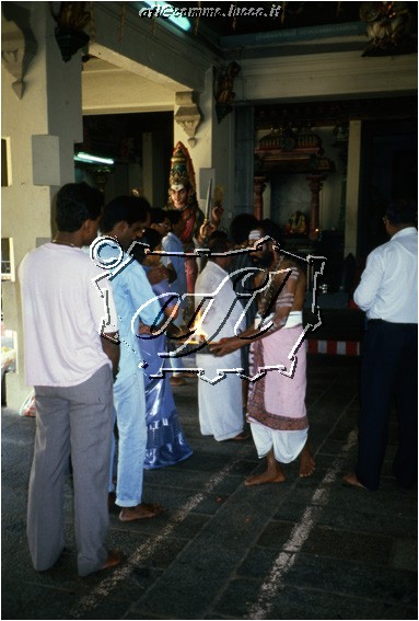 [Singapore : quartiere cinese di Chinatown : tempio indù di Sri Mariamman : induista che esegue una cerimonia : ottobre 1987 (RGS 8021)]