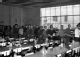 [Lucca : stabilimento tessile Cucirini Cantoni Coats in località Acquacalda : la sala del refettorio con le maestranze in fila al banco self-service : 1974 (CCF 860)