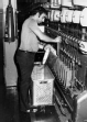 [Lucca : stabilimento filati Cucirini Cantoni Coats in località Acquacalda : reparto Ritorcitura : operaio impegnato a togliere le bobine dal torcitoio : ca. 1974 (CCF 2242)