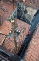 [Lucca : opera di restauro della Torre delle Ore : scorcio verso terra dalla sommità della Torre durante il sollevamento di una trave nuova alla cella campanaria : ca. 1974-1975 (UTS 655)]