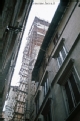 [Lucca : opera di restauro della Torre delle Ore : scorcio dal basso della Torre da via dell'Arancio durante il sollevamento di una trave nuova alla cella campanaria : ca. 1974-1975 (UTS 657)]
