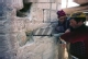 [Lucca : opera di restauro della Torre delle Ore : estrazione delle vecchie pietre del paramento murario : operai al lavoro con il trapano per praticare nella pietra i fori per i cunei : ca. 1974-1975 (UTS 675)]