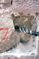 [Lucca : opera di restauro della Torre delle Ore : estrazione delle vecchie pietre del paramento murario : particolare della perforazione della pietra con il trapano : ca. 1974-1975 (UTS 677)]