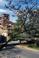 [Lucca : veduta del primo tratto di via Elisa, con la facciata tergale della chiesa di San Ponziano, tra i ramoscelli di un albero in fiore : ca. marzo 1997 (CPS 1177)]