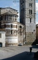 [Lucca : piazza del Collegio con la facciata absidale della chiesa di San Frediano e la parte inferiore del campanile : aprile 1979 (CPS 1182)]