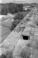 [Lucca : acquedotto monumentale opera di Lorenzo Nottolini : scorcio della parte superiore delle arcate, prima dei lavori di ripristino, con mattonella rimossa sul condotto delle acque : agosto 1974 (UTR 2529)]