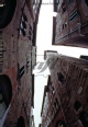[Lucca : scorcio dal basso della Torre delle Ore e dell'antistante casa-torre in via Fillungo, eseguito con obiettivo fish-eye : ca. agosto 1995 (CPS 1853)]