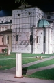 [Lucca : veduta notturna di piazzale Monsignor Giulio Arrigoni con esposizione di opere dello scultore Pino Castagna : ottobre 1976 (CPS 1957)]
