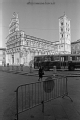 [Lucca : piazza San Michele : veduta con la chiesa di San Michele e un pullman della CLAP con scritte di protesta : febbraio 1977 (CPR 3684)]