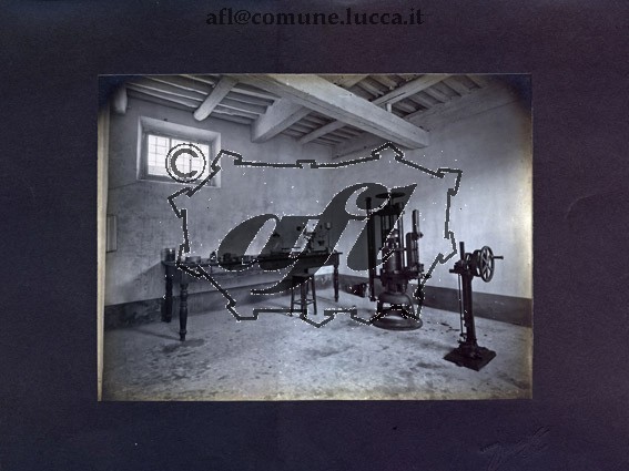 Fra le attrezzature si riconoscono una bilancia del Michaelis (sul tavolo, a destra) e una pressa idraulica; indicazioni di Antonio Gemignani.