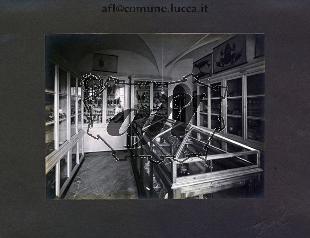 [Lucca : Istituto Tecnico "Francesco Carrara" presso Palazzo Buonvisi : interno : Gabinetto di Storia Naturale : collezione ornitologica e esemplare di coccodrillo impagliato : ca. 1920-1925 (UCF 614)]
