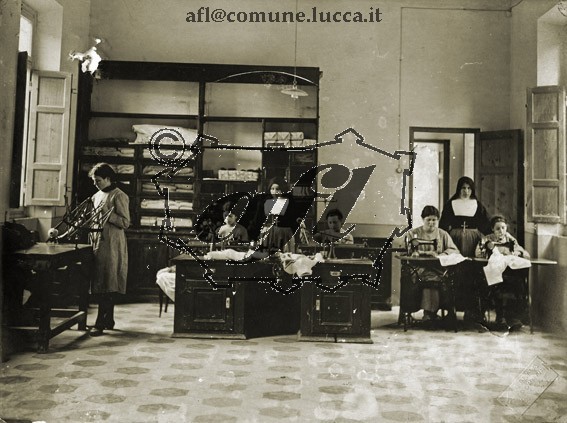 [Lucca : Mutigliano : Colonia Agricola : aula del laboratorio di taglio e cucito con alunne : 1924 (VAF 264)]