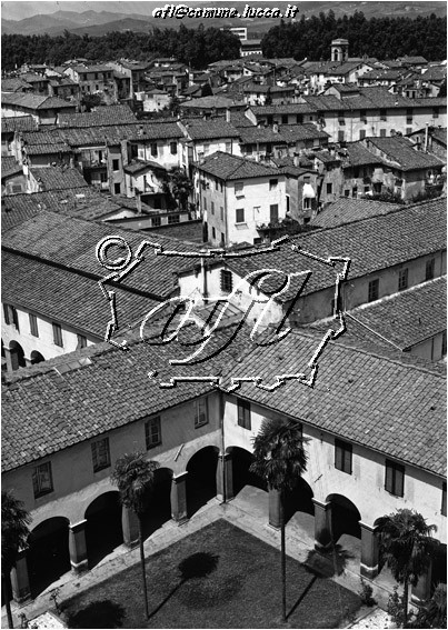 [Lucca : veduta verso nord dal campanile della chiesa di San Francesco, con un chiostro del convento di San Francesco : ca. 1967 (UDN 54)]