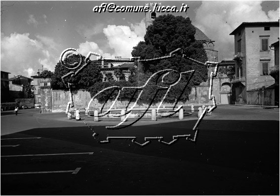 [Lucca : piazza Antelminelli : la fontana di Lorenzo Nottolini; sul fondo, il muro di cinta del giardino di Palazzo Bernardi, oggi Micheletti : ca. 1967 (UDN 157)]