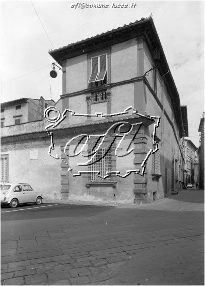 [Lucca : Palazzo Sanminiati in piazza Antelminelli : porzione della facciata e scorcio del fianco su via delle Trombe : ca. 1967 (UDN 165)]