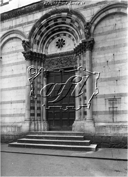 [Lucca : chiesa di San Cristoforo : particolare della facciata con il portale centrale : ca. 1967 (UDN 171)]