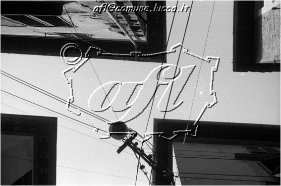 [Lucca : scorcio dal basso dei palazzi di una via del centro storico, con il profilo dei tetti stagliato contro il cielo diurno : ca. 1967 (UDR 1498)]