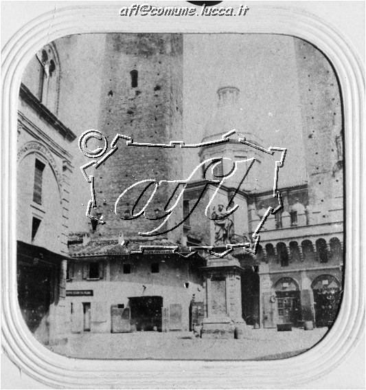 [Bologna : piazza di Porta Ravegnana : la statua di San Petronio e la porzione inferiore della Torre Garisenda prima delle modifiche di fine '800 (EFP 179)